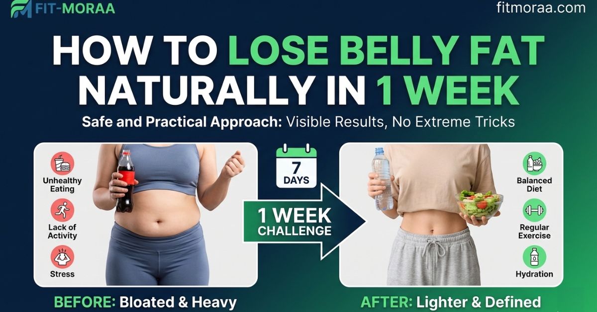 How to lose belly fat naturally in 1 week ko realistically samjhiye. Diet, exercise, drinks, sleep aur daily habits jo pet ki charbi kam karne me madad karti hain.